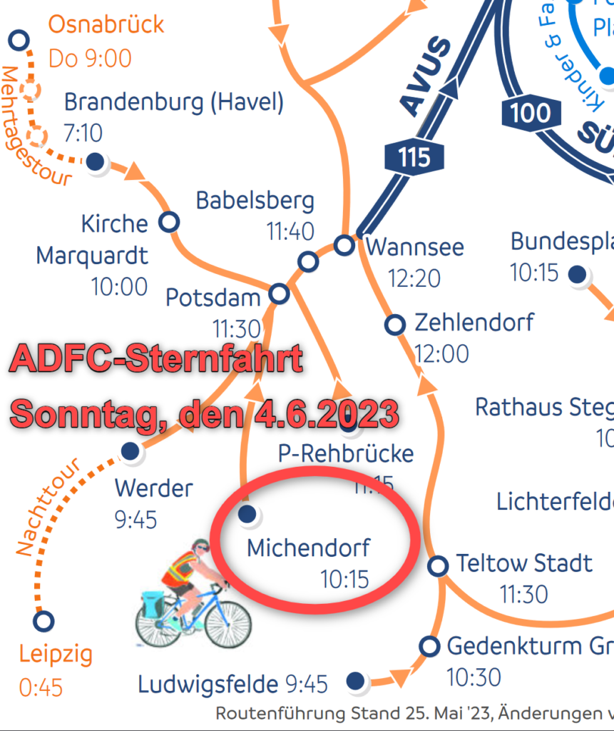 Die ADFC Ortsgruppe Michendorf hat erreicht, dass erstmalig auch offiziell von Michendorf aus zum Fahrradhighlight des Jahres gestartet wurde. Die Teilstrecke der Sternfahrt von Michendorf bis zum Potsdamer Hauptbahnhof stand unter dem Motto „Radschnellverbindung von Beelitz über Michendorf nach Potsdam!“. Für diejenigen, denen die 38 km bis zum Großen Stern in Berlin zu weit waren, lohnte sich auf jeden Fall auch die Teilstrecke. Sie bot darüber hinaus eine gute Gelegenheit, zu erfahren, dass die Radverbindung zwischen Michendorf und Potsdam dringend einer Verbesserung bedarf.