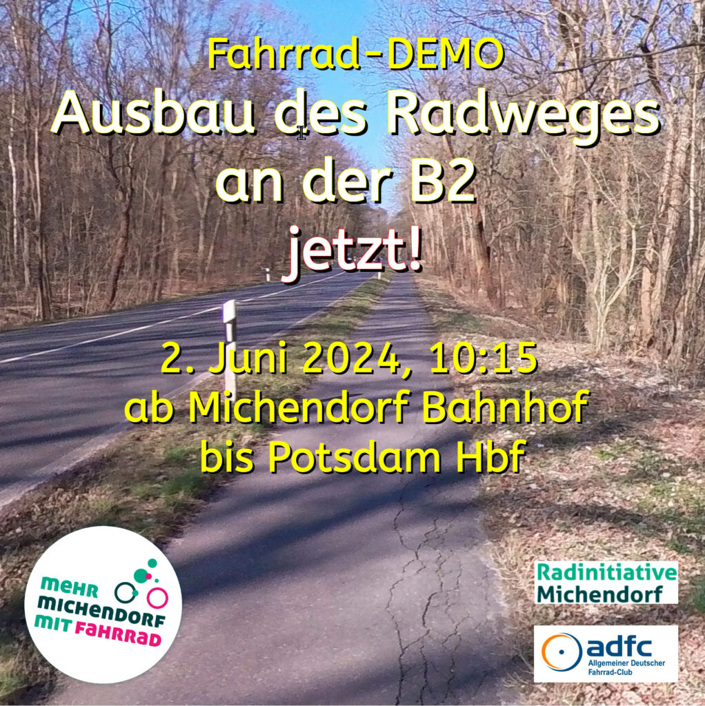 Der Radweg an der B2 ist in einem sehr schlechten Zustand und er ist für das hohe Radverkehrsaufkommen viel zu schmal. Deshalb ruft die Radinitiative Michendorf auf, sich an der Fahrraddemo am 2. Juni 2024 um 10:15 Uhr zu beteiligen. Die Demo geht bis zum Potsdamer Hauptbahnhof, ist aber auch gleichzeitig Teil der ADFC-Sternfahrt und wer mag, kann über die AVUS bis zum großen Stern mitradeln. Bis zum Potsdamer Hbf sind es 12 km, bis zum Großen Stern bzw. Technik-Museum sind es 43,5 km.