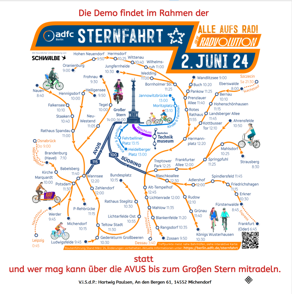 Der Radweg an der B2 ist in einem sehr schlechten Zustand und er ist für das hohe Radverkehrsaufkommen viel zu schmal. Deshalb ruft die Radinitiative Michendorf auf, sich an der Fahrraddemo am 2. Juni 2024 um 10:15 Uhr zu beteiligen. Die Demo geht bis zum Potsdamer Hauptbahnhof, ist aber auch gleichzeitig Teil der ADFC-Sternfahrt und wer mag, kann über die AVUS bis zum großen Stern mitradeln. Bis zum Potsdamer Hbf sind es 12 km, bis zum Großen Stern bzw. Technik-Museum sind es 43,5 km.